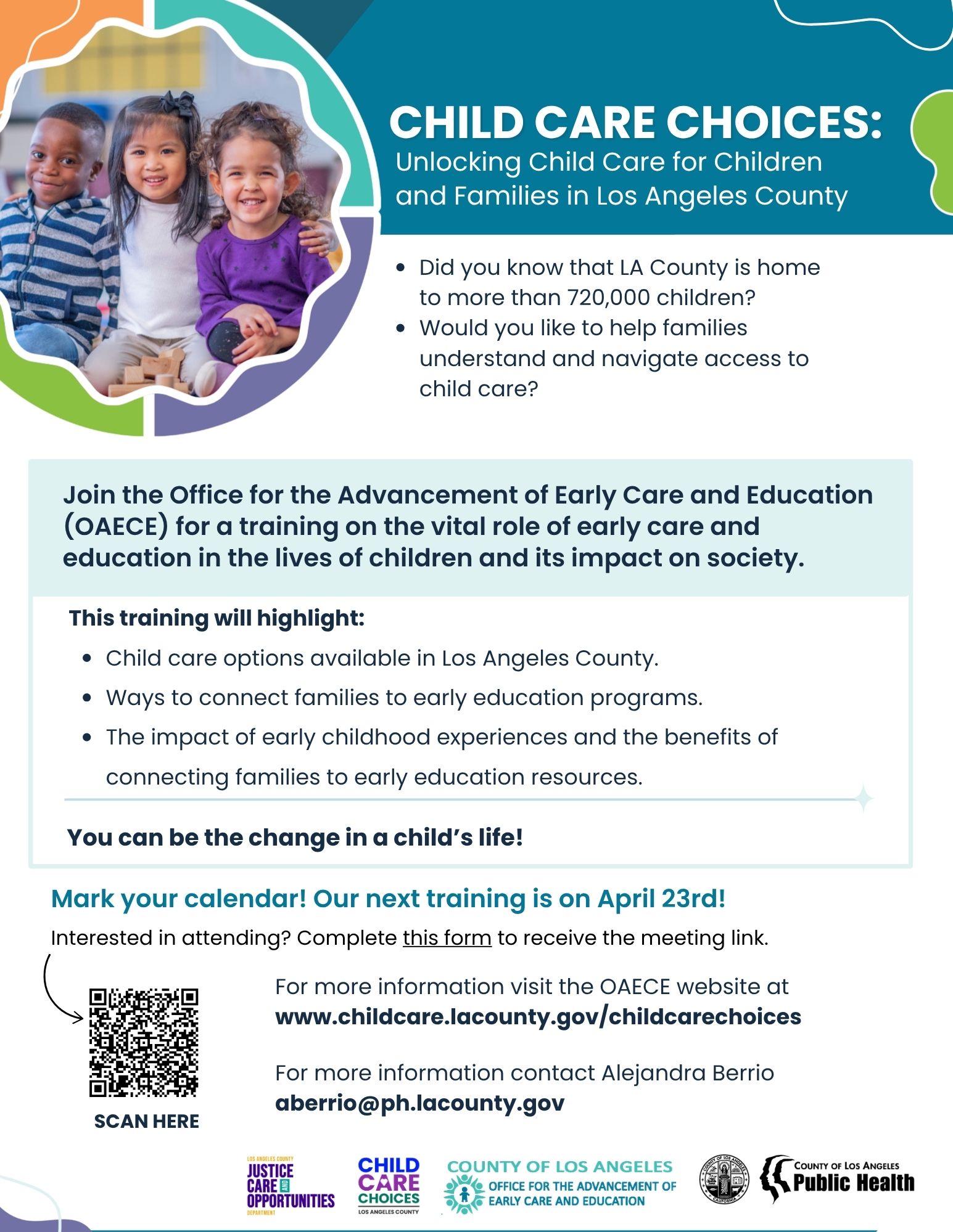 For more information about the Child Care Choices training or to schedule a training, please contact Alejandra Berrio at aberrio@ph.lacounty.gov.